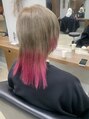 ブリーチ回数は1回。(リタッチ部分のみ使用)サイドの毛先、襟足部分はピンクにデザイン◎伸ばしかけウルフのちょっとしたデザインにオススメ♪ミルクティーとピンクは組み合わせの相性もばつぐんです◎