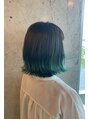 毛先を一度ブリーチでグラデーションの土台を作り、2度目のカラーで全体的にアクセントカラーのグリーンをオンカラー。根元、中間の赤みも抑えながら毛先はビビットに。アクセントカラー好きな方にはオススメです^^