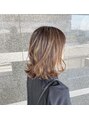 肩ラインでやや前上がりにしたヘアスタイル。細かく入れたハイライトにグレージュをオン。スタイリングした時も結んだ時も可愛いく仕上がるように。 カラーした時にはトリートメントもプラスしてダメージをより低減!