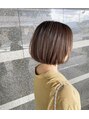 襟足、サイドとスッキリさせたボブスタイル。カラーリングでは明るめのフォギーベージュで柔らかさを。 後にはコアミートリートメントで質感よく。