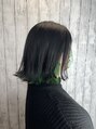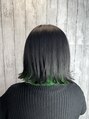 インナーカラーを鮮やかなグリーンにして、表面をブラックにした切りっぱなしボブの推し活カラーです☆表面がブラックなので、伸びてきてもわかりにくいので、なかなかカラーができない方にもオススメです♪後ろの部分にも鮮やかグリーンをいれています。