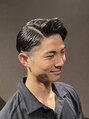 強いくせ毛の持ち主さん。ツーブロックショートをベースに七三分け×オールバックに自然な流れをつけたスタイリングで、フォーマルな場でも魅力的に映えます。クラシックなスタイルに現代風アレンジを取り入れた、大人の色気と魅力が際立つスタイルです。
