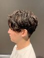 ミディアムショートの前下がりマッシュに緩めのメンズパーマで動きをつけました。ツーブロックとの相乗効果でセクシーな印象に。センターパートでおでこを見せるとスッキリ感も出て、ストレートのセンターパートよりも格段にオシャレ度がアップします!