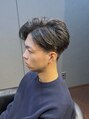 トップはやや前下がりのシルエットで毛束感がでるようにカット。襟足と耳周りはすっきりツーブロックにして、サイドパートのアップバングで仕上げたモテスタイル。ノンスタイリングで下ろしても自然なスタイルになるようデザインしています。