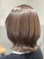 アッシュカラーで赤みを抑え、やわらかく透明感のある色味に仕上げました。カットは、首元にくびれができるようにレイヤーを入れ、後ろ姿も立体的に見えるシルエットに。動くたびに表情が変わり、重く見えがちなボブスタイルも軽やかな印象になります。