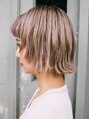 ホワイトベージュのハイトーンが可愛い切りっぱなしのショートボブスタイル。ぱつっとしたラインが外ハネをきれいに見せてくれます。またショートバングにすることで重たの感じない顔まわりが明るく見えるスタイルです。【ブリーチ/ボブ/レイヤーカット】