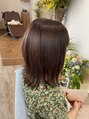 髪質改善カラー、外ハネワンレングス。通常のヘアカラーよりも色持ち、艶、手触りを大幅に向上させることができるトリートメントカラーです。効果は1カ月程持続します。カットはワンレングスベースなので根本から毛先まで均一な艶がでます。