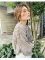 ブリーチなし。ベージュ系カラー。レイヤーの入ったカットベースをアイロンでランダムに巻いて簡単に後ろでまとめたヘアアレンジ。