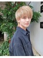 ブリーチ1回~2回。脱色したベースにナチュラルベージュをオンカラー。カットはメンズウルフ。