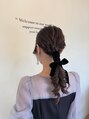ふわふわローポニーに黒のベロアリボンを組み合わせたヘアセット。ローポニー部分はふわふわに引き出し、リボンはタイトに巻き付けてメリハリのあるスタイルに仕上げました。