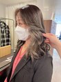 全体のグレージュにイヤリングカラーでホワイトベージュをデザインで入れたカラーです!ブリーチ1~2回で出来るのでケアブリーチがオススメです◎前髪はセンターパートで流しやすいように作ってます!コテを通すだけでスタイリングできるので是非◎