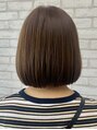 アゴラインのシンプルなミニボブです。茶色系をベースにした やや明るめのモカベージュのカラーで とても柔らかな印象です。赤味を抑えつつも くすみ感や にごりのないモカベージュは肌色をキレイに見せる効果とツヤ感のある万能なカラーでオススメです。