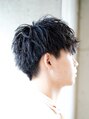 前髪長めの前下がりマッシュショートベース。トップが長め毛先を軽くしすぎない事が今っぽいバランスに!ツイストスパイラルとスパイラルをミックスしてかけて無造作にルーズに!男らしく色気のあるスタイルに!