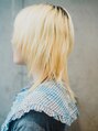 ミディアムレングスのマッシュウルフがベース。顔まわりを包み込むようにレイヤーを入れている。カラーは、ブリーチを2~3回してホワイトブロンドにして、根元はあえて黒を残し、顔まわりにランダムにアイスミントを入れ抜け感を!
