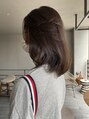 透明感のあるブラウンカラーのミディアムヘアです。前髪は小顔に見える長さと重さです。表面と前髪を巻くだけの簡単スタイリングヘアです。作り込みすぎないのが大人なカジュアルさがでます。