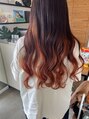 スーパーロング・アプリコットオレンジのグラデーションカラーリング。 アンダーはランダムに毛先をブリーチ。トップミドルには中間からブリーチを入れて。 アルカリカラーと塩基性カラーをミックスしてオレンジをオンカラー