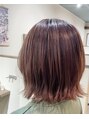 ぱつん、と切り揃えたトレンドのボブ。ストレートアイロンで軽く整えたらヘアオイルを馴染ませ、ささっとスタイリングできます。カラーは12レベル程に褪色した状態にペールピンクを、インナーカラーはケアブリーチ後にスモーキートパーズをオン。