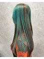 TOPとインナーはブリーチが必須になります。ターコイズブルーの表面のアンブレラカラーと襟足のインナーカラーをMIX!カラーの色落ちもお楽しみいただけます。個性派カラーのご相談お受けします。たくさん提案させていただきます。