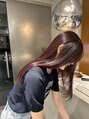 深みのあるレッドカラーでツヤ感たっぷりのロングヘアに。光に当たるたびに色味が変わり、上品さと可愛さを両立したスタイルです。ストレートでもしっかり存在感のあるカラーに仕上げました