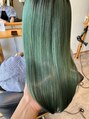 沿岸でお仕事が1ヶ月くらいあったのとブリーチもしてる方だったのでプレミアムコースで最高にいたわりながらカラーしていきました!根本の黒は活かして鮮やかグリーンに!