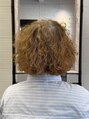 スパイラルパーマに肌馴染みの良いピンクベージュで、大人女性の柔らかさを引き出しました。白髪を味方につけることで、ダメージを抑えつつ鮮やかな発色に。オイルを揉み込むだけの簡単スタイリングで決まる、立体的なウェーブボブ。