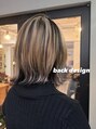 顔まわりにレイヤーを効かせたミディアムボブ。ハイトーンベージュにダークトーンを差し込んだデザインカラーで、動きと立体感を演出。軽さと個性を両立した大人カジュアルなスタイル。