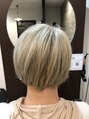 ベースはハイブリーチからのホワイトベージュ系のカラーです。襟足を刈り上げたショートのスタイルです。ムラサキシャンプーを使うとカラーを長く楽しめます。