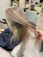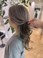 過去のブリーチハイライトと白髪を活かして全体のグレージュ感をつくっています。襟足も過去のインナーの名残りの上に薄いブルーを被せて少しニュアンスをかえています。カット担当:他サロンスタイリスト様スタイリング:NATASHA(銀座本店スタイリスト)
