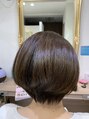 ナチュラルショートボブになります。毛先を軽くしすぎないことで、まとまりがよくなります!軽やかなイメージにするため、グレージュベースで明るめにカラーをしました。