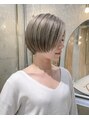 ブリーチ2回で柔らかいホワイティーなグレージュに。退色もキレイにまろやかです!サイドにラインのあるショートでシルエットにメリハリを持たせハイトーンでもぼやけないヘアスタイルにしています!