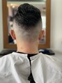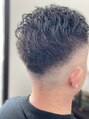 フロント、トップにパーマをかけて前髪を上げてサイドに流したヘアスタイル。周りは薄めのバリカンでフェードを入れ、男らしさを表現した仕上がりです。