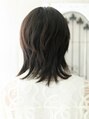 襟足を長めに残したミディアムウルフ。センターパートで長めバングをサイドに自然に流したアンニュイなスタイル。セミウェットにしたり、パーマをかけても◎