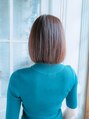 肩につかないくらいのぷつっとボブ。毛先をすきすぎない少し重めのスタイル。前髪は目にかかるギリギリくらいの長さで、透け感のある薄めのバングになっています。サイドは外に流れるようにカットしているので巻いた時にナチュラルに仕上がります!