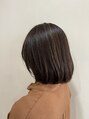 ナチュラルな前上がりのボブベース、ミディアムスタイルです。伸ばし中なので、全体的に細めのハイライトを入れて飽きがこないようにしています。はねやすい長さですがボブベースでカットする事で比較的まとまりやすくセットがやりやすいスタイルです。