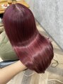 地毛、カラーのみの髪に1回のブリーチでできるツヤツヤなレッドカラーです赤単品でなく紫を少し混ぜているので派手すぎず、深みのあるレッドに!1ヶ月に1回のカラーと、2ヶ月に1回の根本ブリーチで維持可能です