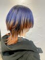 上は青みの強いバイオレットブルー、下はビビッドなオレンジで彩った、インパクト抜群のバイカラースタイル。ぱつっとラインのくびれカットと組み合わせ、ストリート感とモード感を両立◎人と絶対に被りたくない方におすすめの個性派スタイルです!
