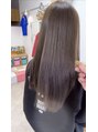 赤みを抑えた柔らかブラウン。最高峰髪質改善トリートメントで内部補修をしながらツヤを最大化。手触り重視のロング美髪スタイル。