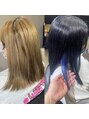 インナーカラーはブルー、全体はブルーブラック☆(ブリーチ有り)赤みを打ち消してくれるお色なので暗髪なのに透明感があり重たく見えず、色落ちが綺麗なのもオススメポイント♪ベースカラーとインナーカラーを同系色にすると、自然でとっても可愛いです☆