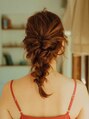 くるりんぱを使った無造作な編みおろしアレンジスタイルです。三つ編みをラフにほぐした抜け感があるスタイルです。後れ毛も自然に馴染むようにニュアンス巻きをしています。二次会やちょっとしたお出かけにおすすめです。【いわき】