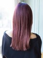胸上くらいのレングスで前髪はやや短め、顔まわりにレイヤーを入れています。フェイスレイヤーはあご下くらいで一段作っていて、サイドの毛先に向けてレイヤーを入れています。カラーはブリーチ後にレッドピンクの色味を入れています。【いわき】】