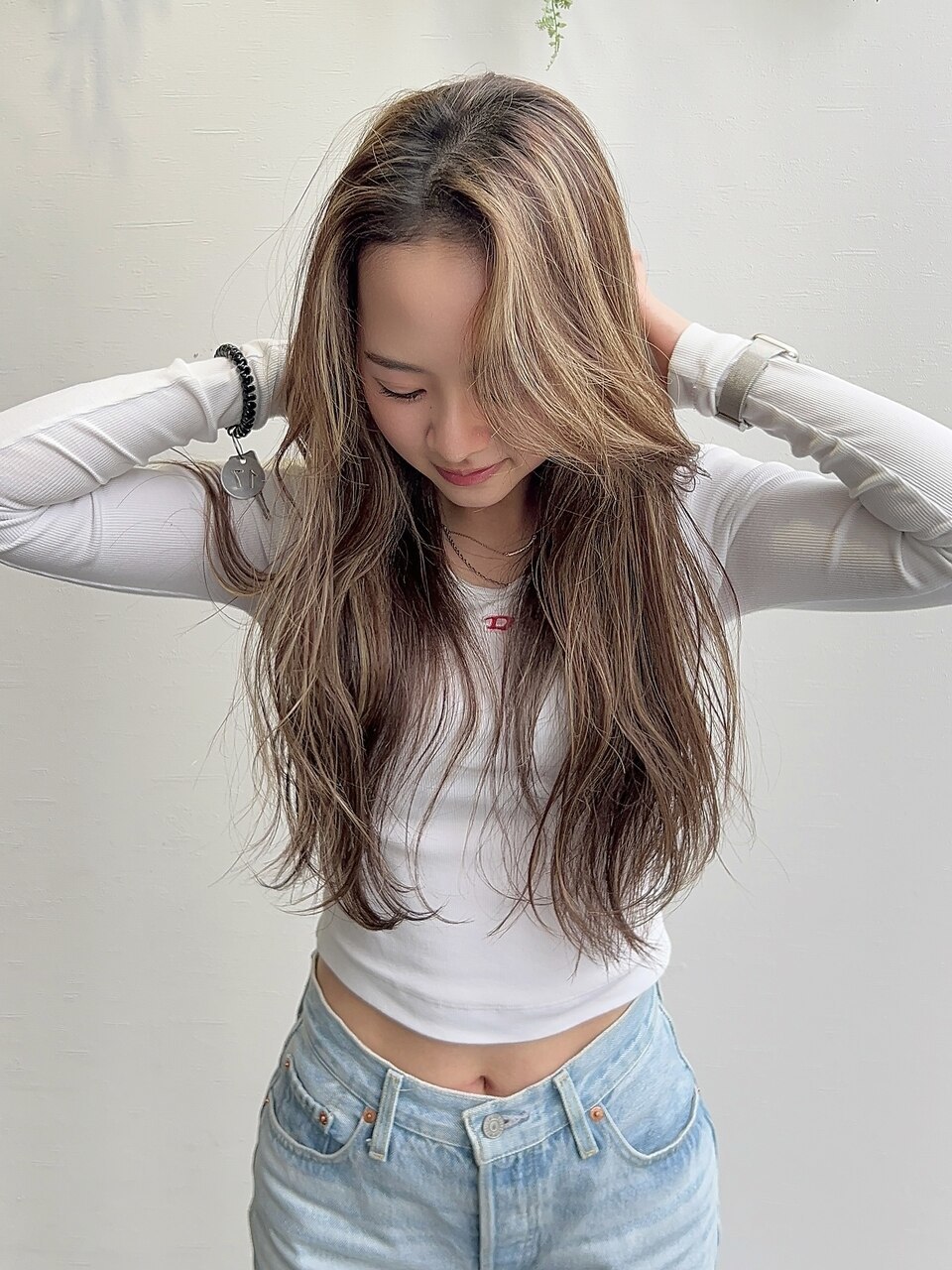 7. レイヤー前髪カット顔周りハイライトベージュ20代30代