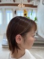 軟毛、細毛でボリュームの出ない方におススメショートです。顔の輪郭、頭の形、首の長さなど補正とバランスを考えてカットします。カラーは脱白髪染めで、隠すのではなく白髪を活かすのでカラーの色味を楽しめます。スパと頭浸浴でふんわりとした仕上がりに。