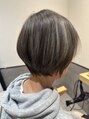 白髪ぼかしハイライトを入れたグレージュカラーです。お顔の横にボリュームをもってくることで全体のバランスがとても良くみえるショートボブです。