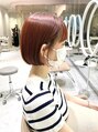 顎ラインで長さを設定した、ミニボブ。乾かすだけでまとまるので、パーマやオイルをつけるだけで決まる、スタイリングが簡単なヘアスタイル!カラーはブリーチなしのチェリーレッドでツヤっと肌もトーンアップしてくれます。
