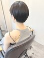 耳にかける前提のショートヘアスタイル。前髪は眉あたりで揃えてカット。クセのある細髪で量の多い方だったので、減らしすぎない、でもできる限り減らす事を考えて毛量調整をしました。