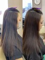 髪質やダメージのレベルに合わせた薬剤選定、ダメージを最小限に抑えるために1人1人にあった処理剤などをご提案しています。『縮毛矯正』髪のダメージに合わせた薬剤選定 栄養補給の処理剤を使いしっかりした縮毛矯正をします。