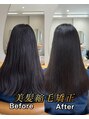 髪質やダメージのレベルに合わせた薬剤選定、ダメージを最小限に抑えるために1人1人にあった処理剤などをご提案しています。『縮毛矯正』髪のダメージに合わせた薬剤選定 栄養補給の処理剤を使いしっかりした縮毛矯正をします。