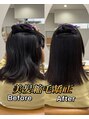 髪質やダメージのレベルに合わせた薬剤選定、ダメージを最小限に抑えるために1人1人にあった処理剤などをご提案しています。『縮毛矯正』髪のダメージに合わせた薬剤選定 栄養補給の処理剤を使いしっかりした縮毛矯正をします。