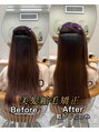 髪質やダメージのレベルに合わせた薬剤選定、ダメージを最小限に抑えるために1人1人にあった処理剤などをご提案しています。『縮毛矯正』髪のダメージに合わせた薬剤選定 栄養補給の処理剤を使いしっかりした縮毛矯正をします。