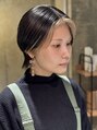 センター分けのショートウルフにフェイスフレーミングカラー(顔周りを囲うようなポイントカラー)でブリーチしてブロンドに仕上げたスタイル。それ以外はナチュラルブラックでメリハリの効いたカラーに仕上げています。